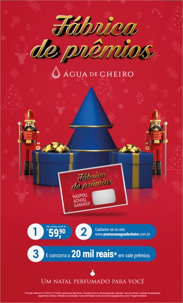 Tendo como objetivo aumentar o ticket medio e impulsionar as vendas de Natal em 2022, a Água de Cheiro realizou a promoção intitulada “Fábrica de Prêmios” para sortear mais de 90 Vale-compras a serem utilizados pelos contemplados nas lojas participantes.