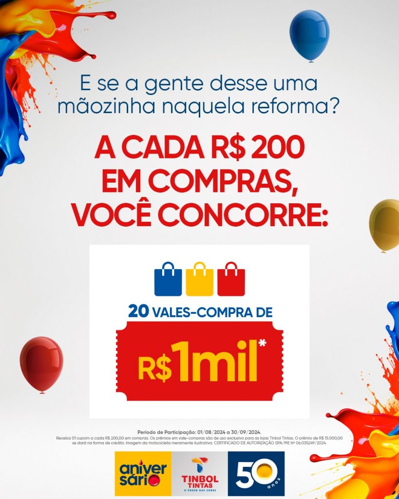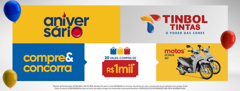 Para comemorar os seus 50 anos de história, a AUTORIZA PROMOÇÕES foi contratada para assessorar na realização de uma campanha promocional intitulada “Aniversario 50 Anos – Tinbol Tintas” para realização de diversos sorteios para premiar os clientes da TINBOL.